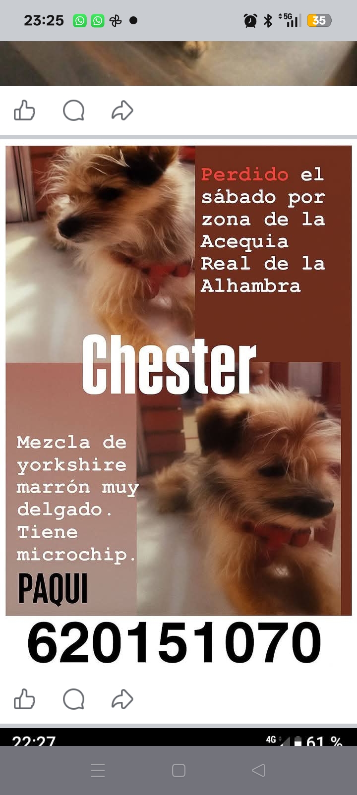 Busco mi perro q se perdió hace cuatro meses y anoche me llamaron diciendo q lo había visto por la acera del Darro q iba solo y no lo pudieron cojer si lo ven llamen al número 620151070