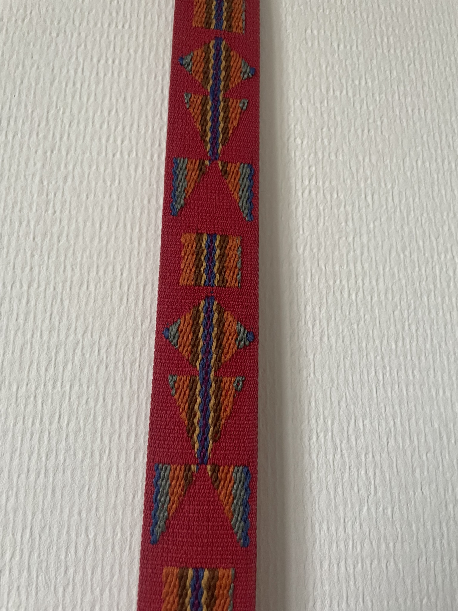• Collaret: si - Es rojo de tela, con formas de distintos colores: naranja, azul, gris, morado, amarillo y marrón. Tiene algunos detalles en cuero. He puesto una foto de la correa para que se sepa exactamente lo que he explicado. )